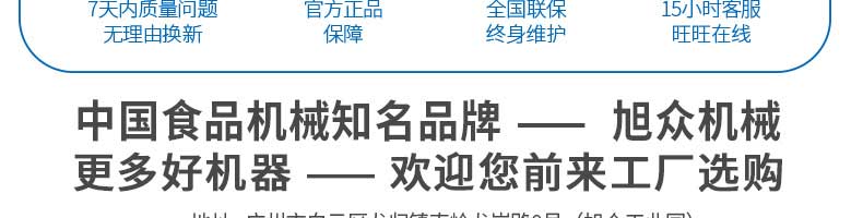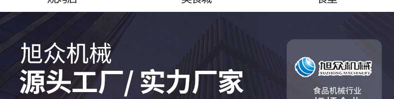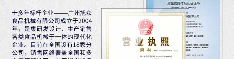 廣州旭眾食品機械有限公司是一家集科研開發(fā),生產設計,營銷服務為一體的現代化生產企業(yè)。現代化生產車間,精湛制造技術,所產機械歷經市場重重考驗,不斷贏得海內外客戶的贊譽。
